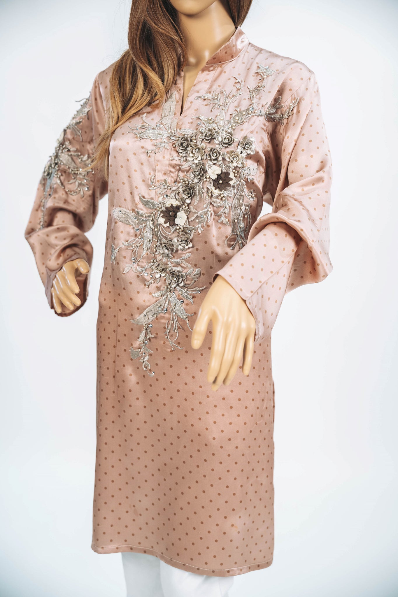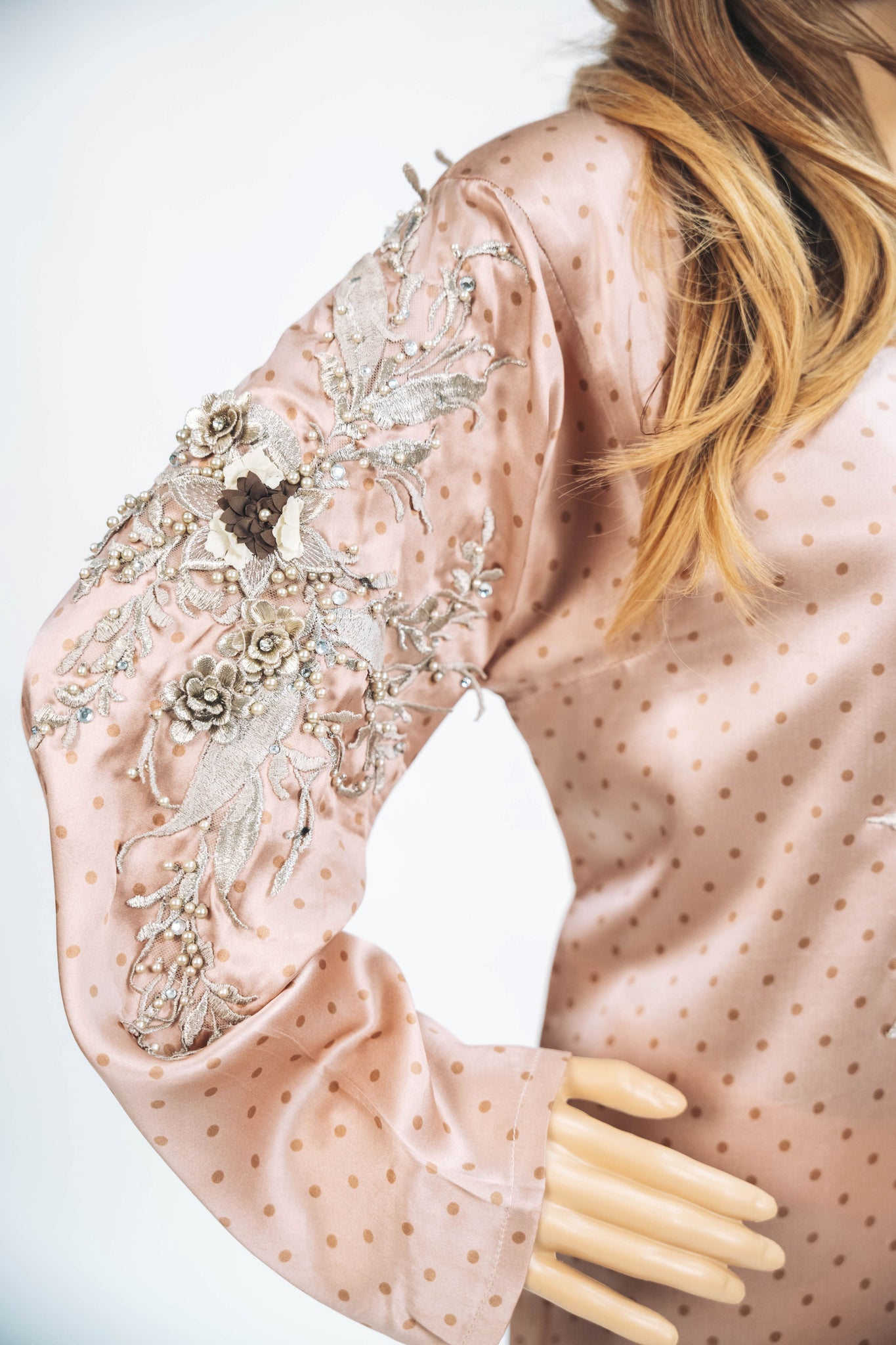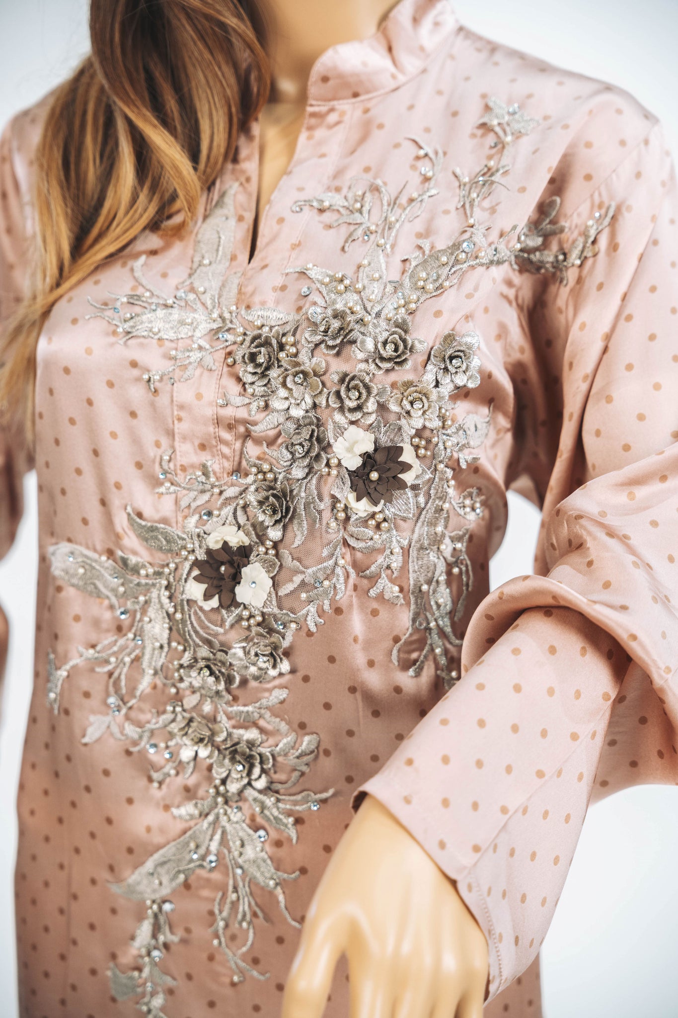 Exquisite silk tunic dress, styled with meticulously crafted floral hand appliqué embellishment adds a touch of charm. A true masterpiece of design this dress is a testament to the enduring allure of classic pattern.